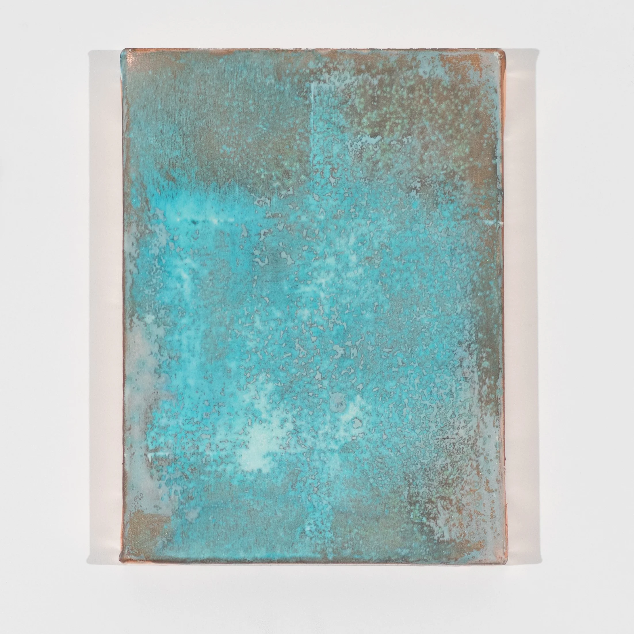 Oxidized copper leaf and glass microspheres on canvas