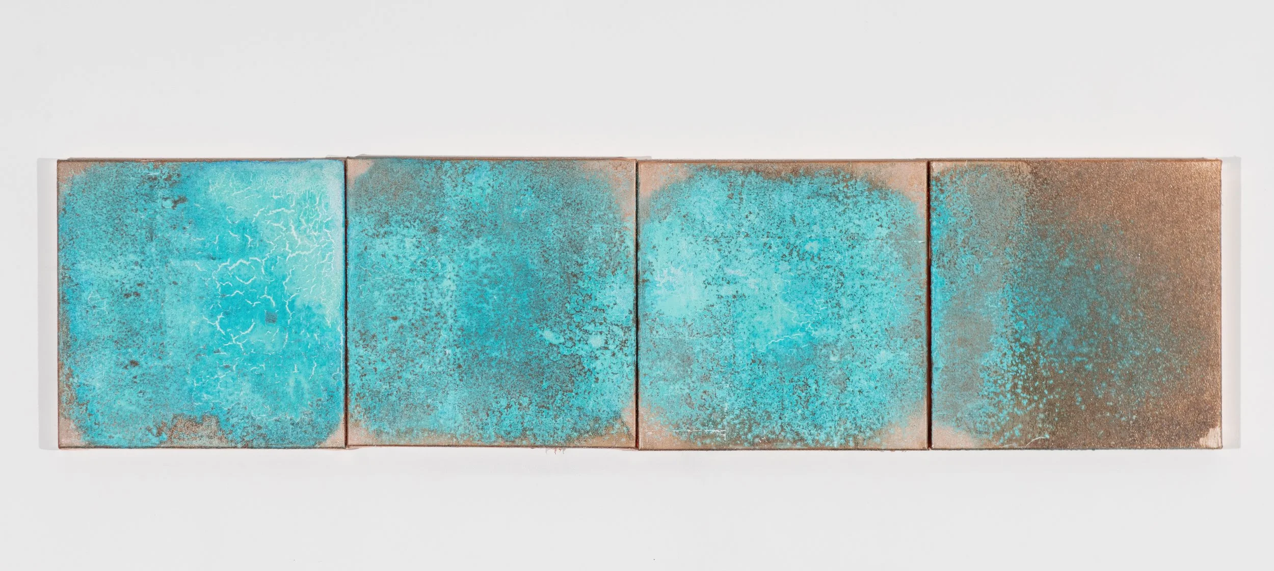 Oxidized copper leaf and glass microspheres on canvas