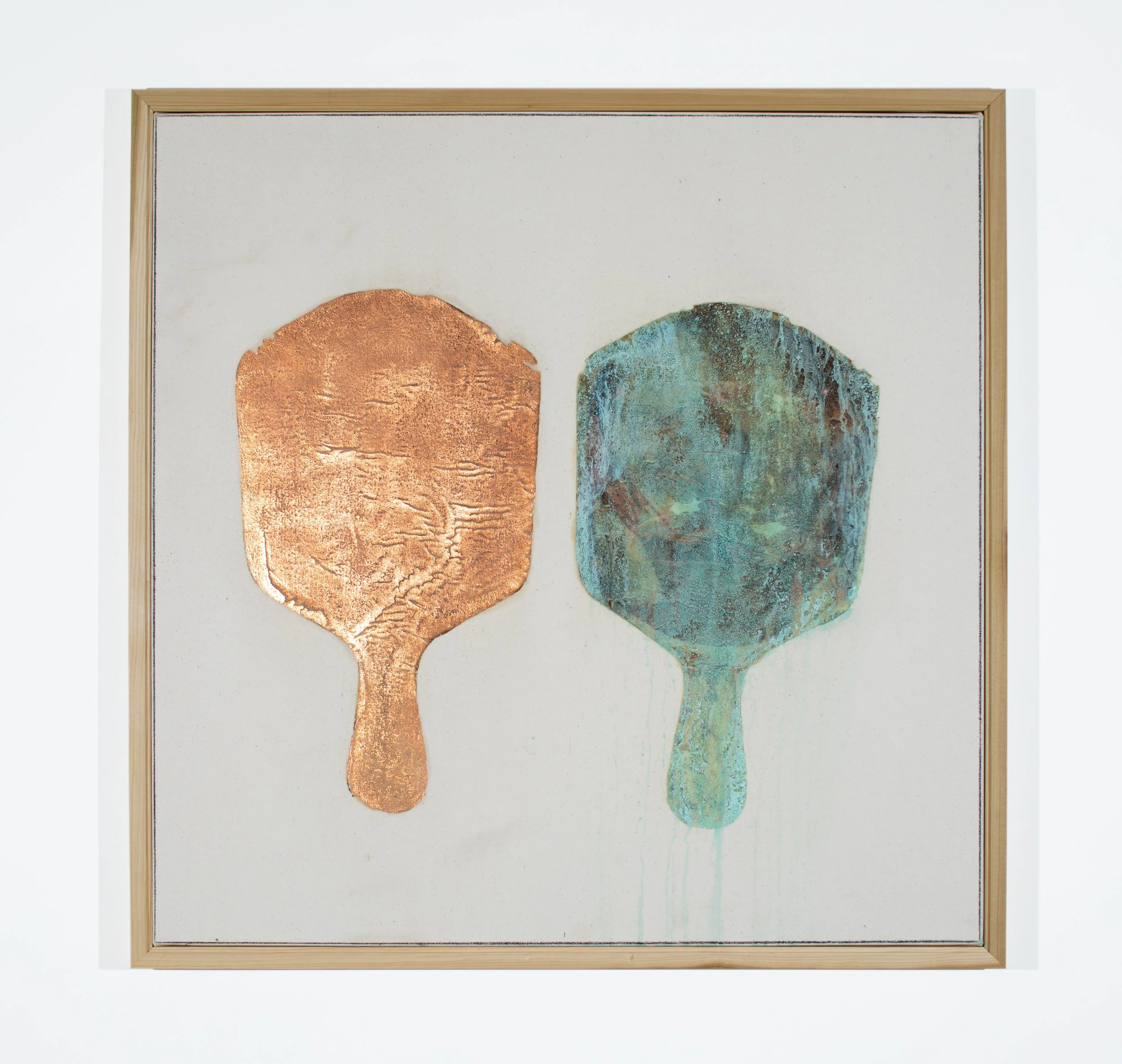 Acrylic image transfer, copper leaf and oxidized copper leaf on canvas