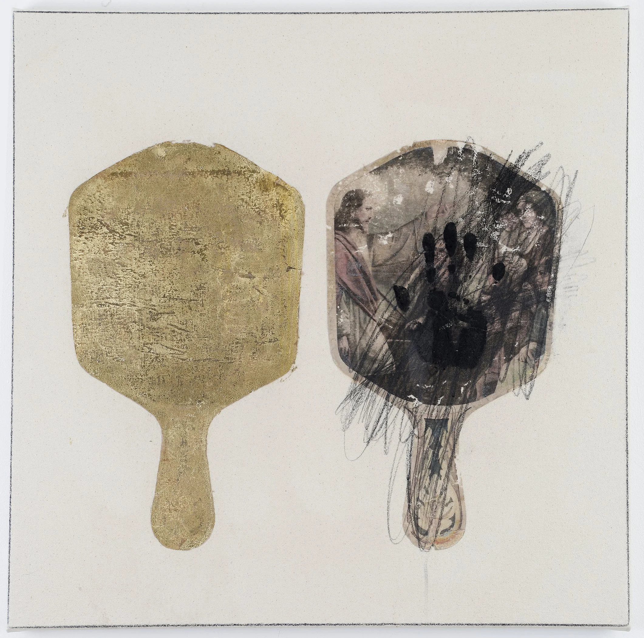 Acrylic image transfer, graphite, charcoal and gold leaf on canvas